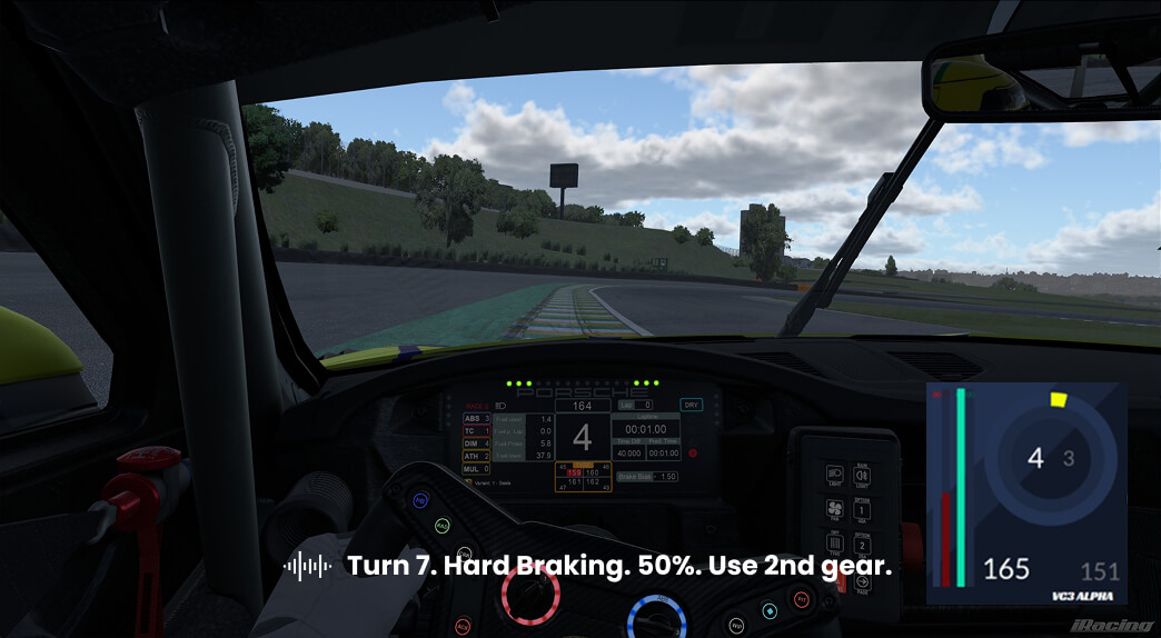 The turn entry lesson will help you to understand how to approach a turn in terms of speed and braking. The virtual coach will give specific hints on how to change your braking to approach the turn just right.